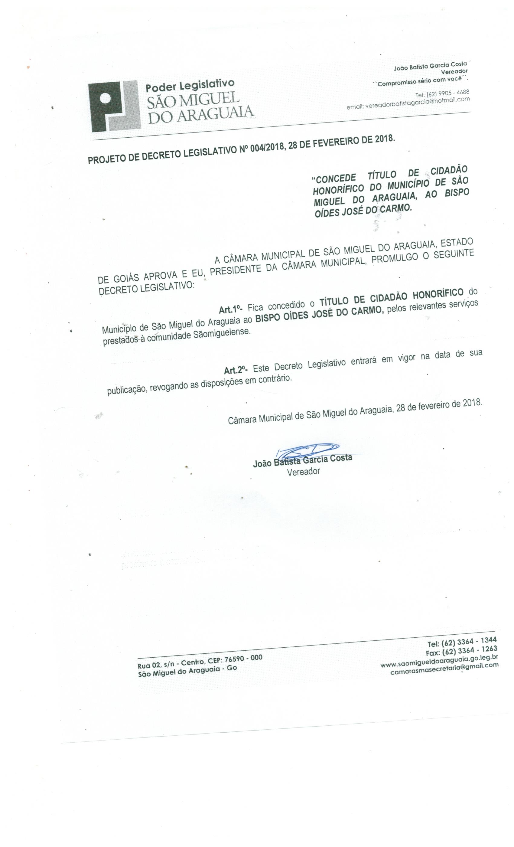 Ementa: CONCEDE TÍTULO DE CIDADÃO HONORÍFICO DO MUNICÍPIO DE SÃO MIGUEL DO ARAGUAIA, AO SENHOR ABINAIR VARGAS VIEIRA.